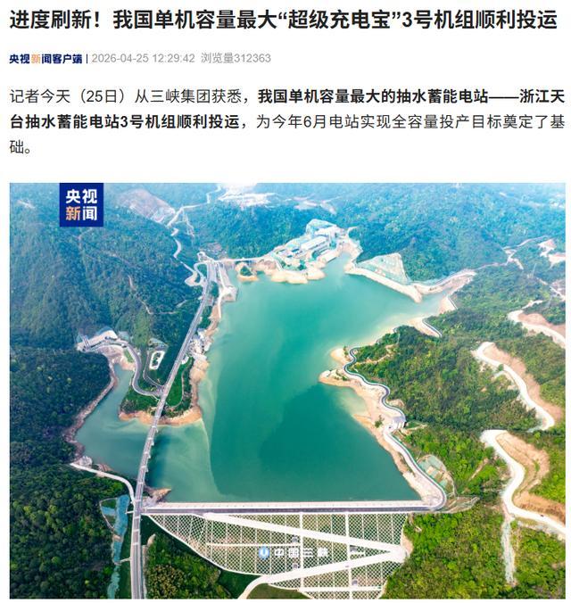 IT之家 4 月 25 日消息,据央视新闻今日报道,记者从三峡集团获悉,我国单机容量最大的抽水蓄能电站 —— 浙江天台抽水蓄能电站 3 号机组顺利投运,为今年 6 月电站实现全容量投产目标奠定了基础。
