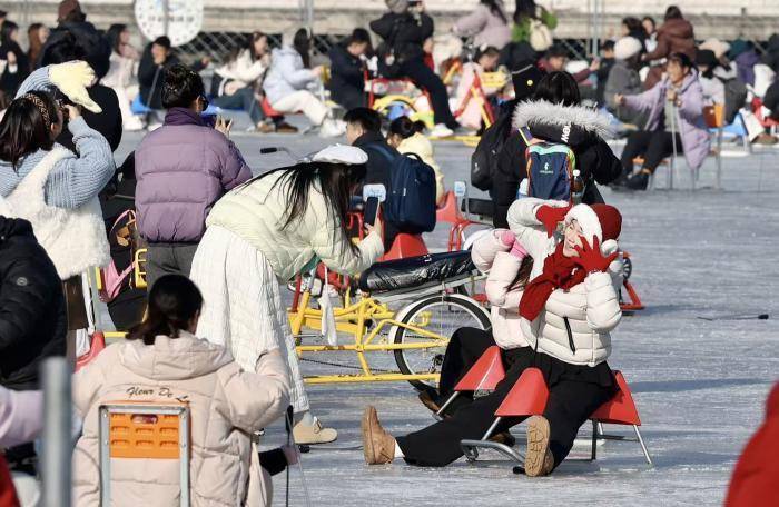 人们不舍错过这季最后的冰上时光,不少游客互相拍照留念,定格这份冬日美好。
